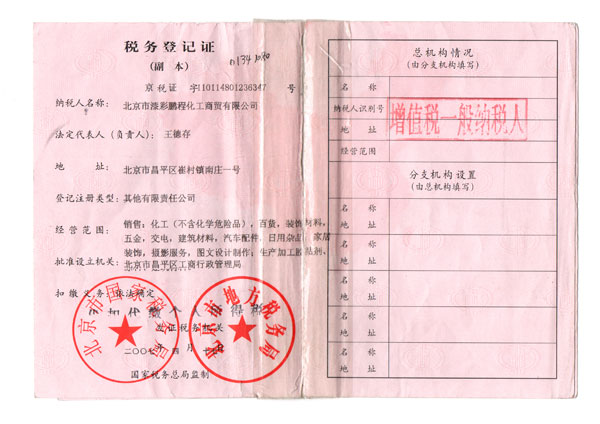 來(lái)源:北京市漆彩鵬程化工商貿(mào)有限公司 關(guān)鍵字:稅務(wù)登記證 發(fā)布時(shí)間:2014-04-24